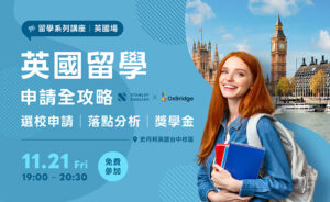 本次我們特別邀請台中津橋留學的資深顧問,來和大家分享留學英國的優勢、申請時程與文件準備、英國大學科系落點分析,以及獎學金的第一手資訊!